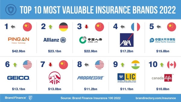 Germany’s Allianz (brand value up 15% to US$23.1 billion) jumped one place in the ranking, overtaking China Life (brand value up 1% to US$22.9 billion) to become the second most valuable insurance brand in the world.