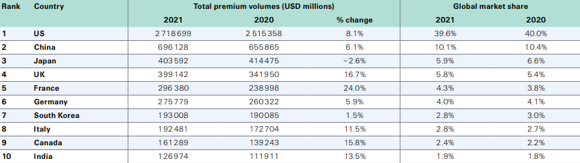 · In Europe, both the UK and France showed strong growth in nominal terms in 2021, with 16.7% and 24.0% increases in total premium volumes, respectively. They remain the 4th and 5th largest markets globally.